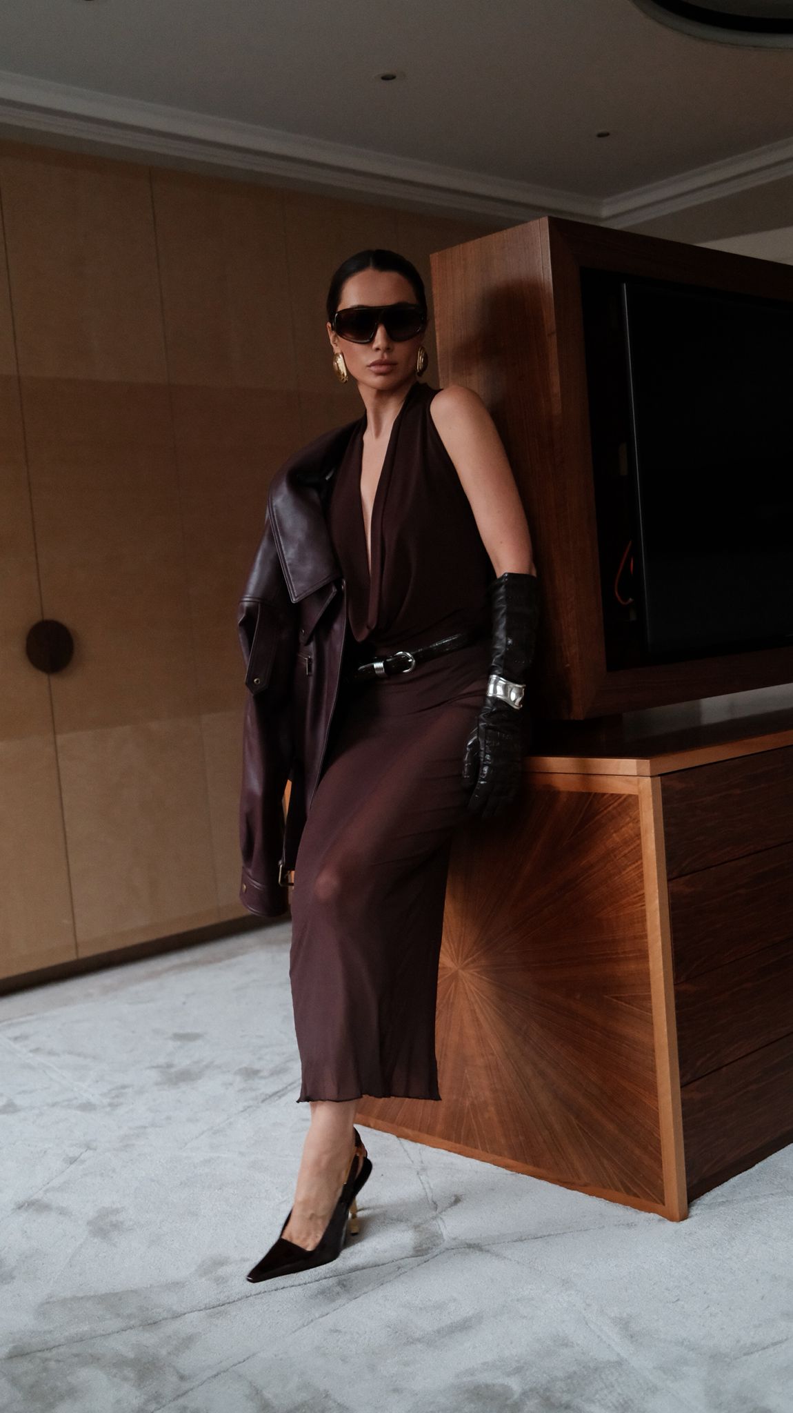 Nadia is a size 8, she is 5'6" and is wearing size S–M. She is pairing the Aura Midi Skirt with the Sphynx Body in Brown.
