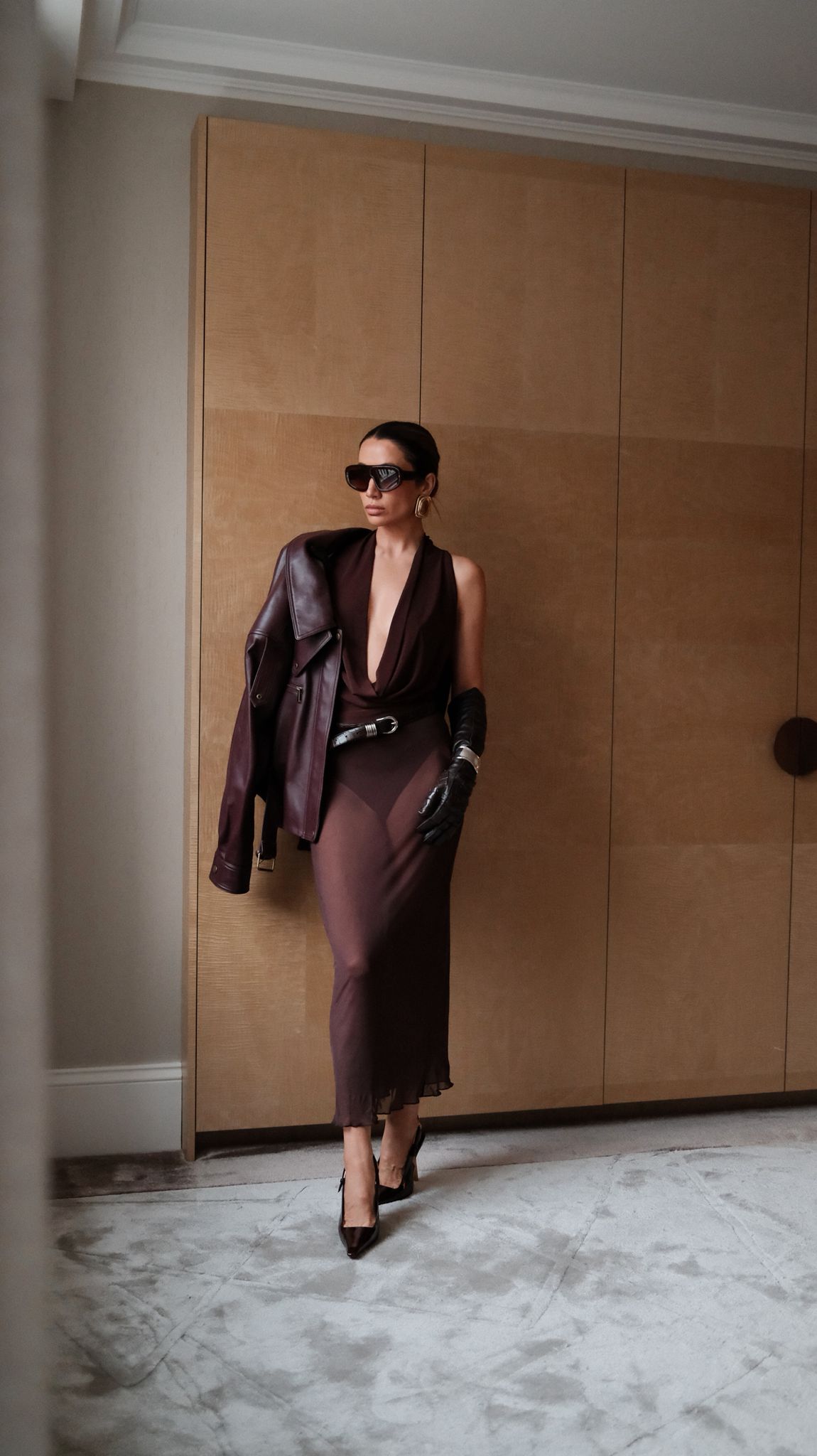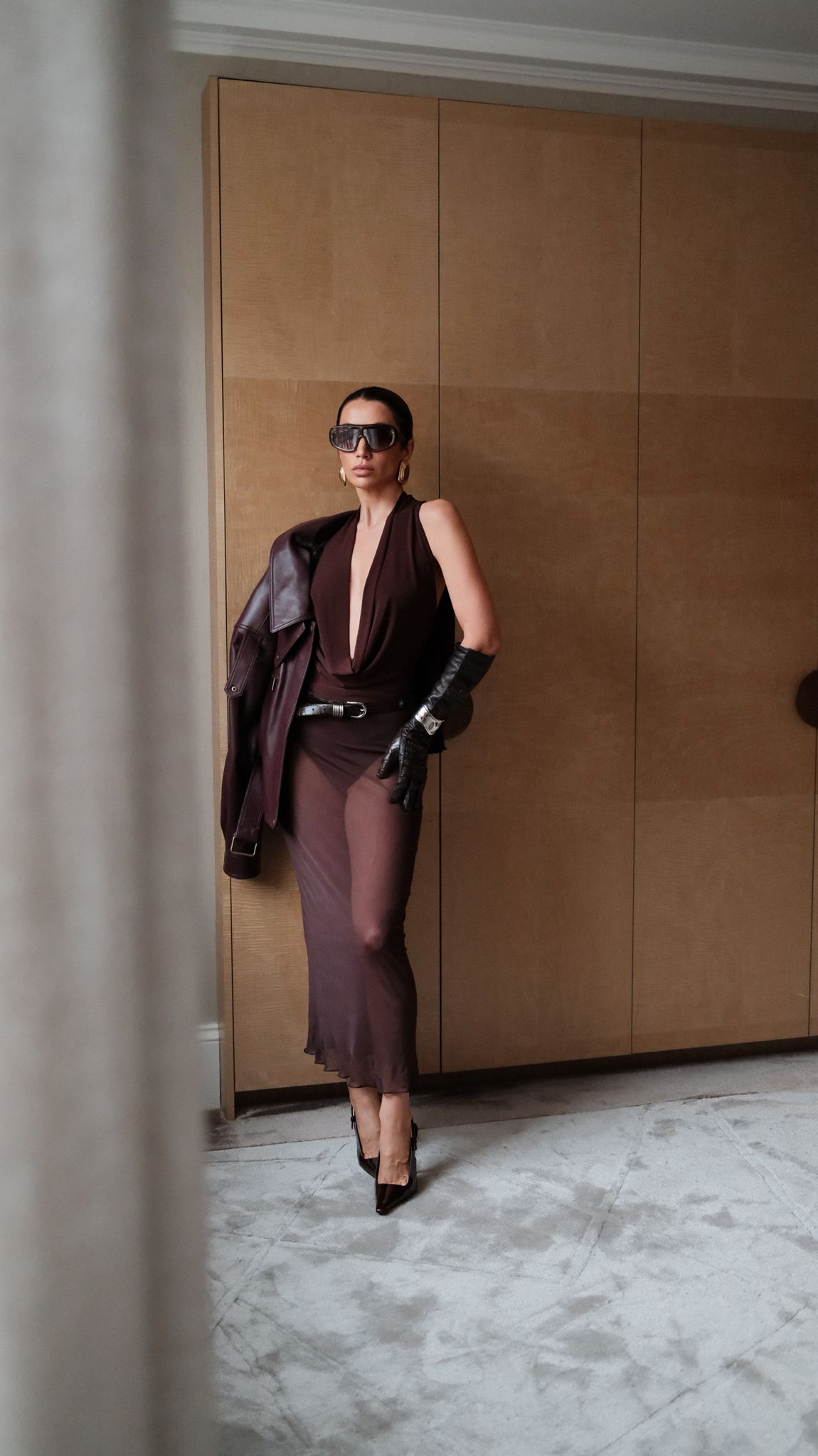 Made in our signature soft stretch mesh, it’s fully sheer, giving it that modern, fashion-editor attitude, balanced by a clean midi length that keeps everything refined. It sits beautifully on the body, skims the silhouette, and moves with you in the most effortless way.