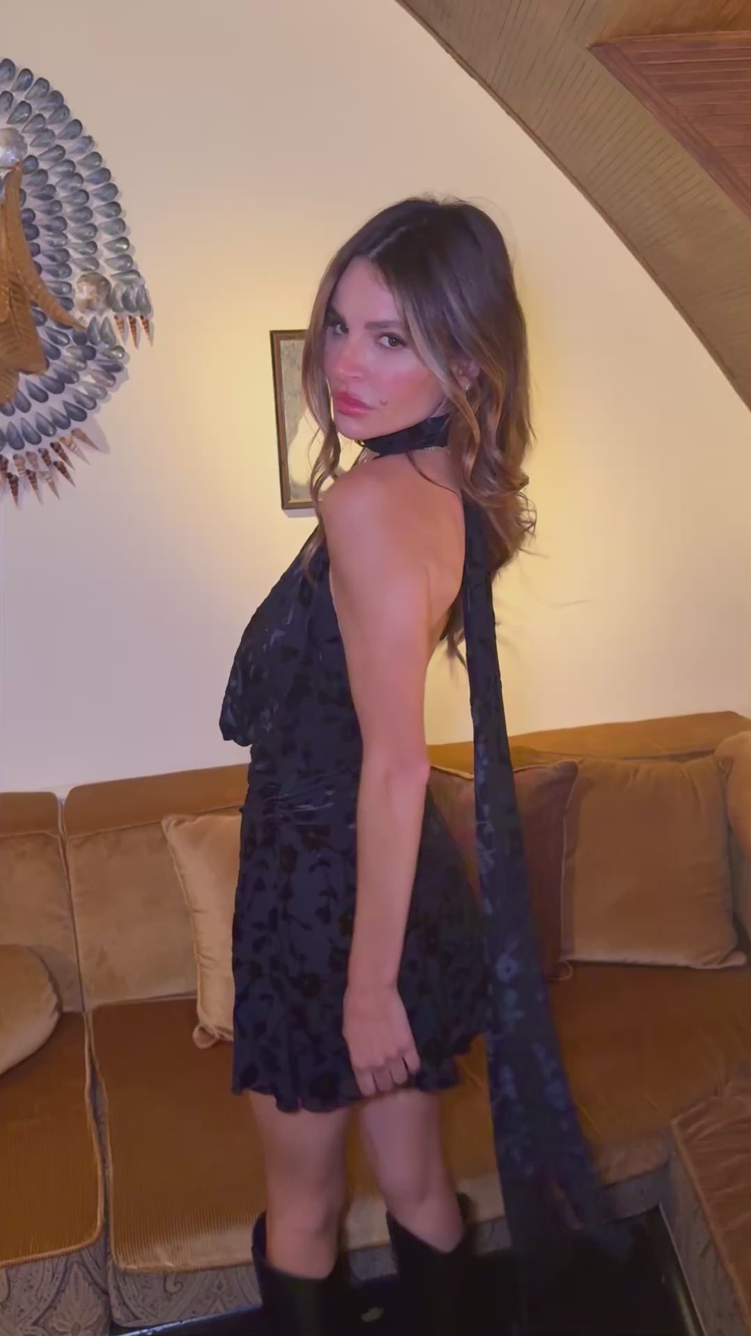 Our Dark Devoree Velvet Mini Dress doesn’t play it safe. With a deep plunge neckline, halter tie, open back, and asymmetric hem, this mini is made to stand out. Whether you wear it out dancing in London with boots or bear foot in the sun, it always feels bold, light, and effortless. Crafted from a luxury burnout velvet stretchy fabric, it’s soft, sculpting, and won’t crease: ready to pack, wear, and turn heads.