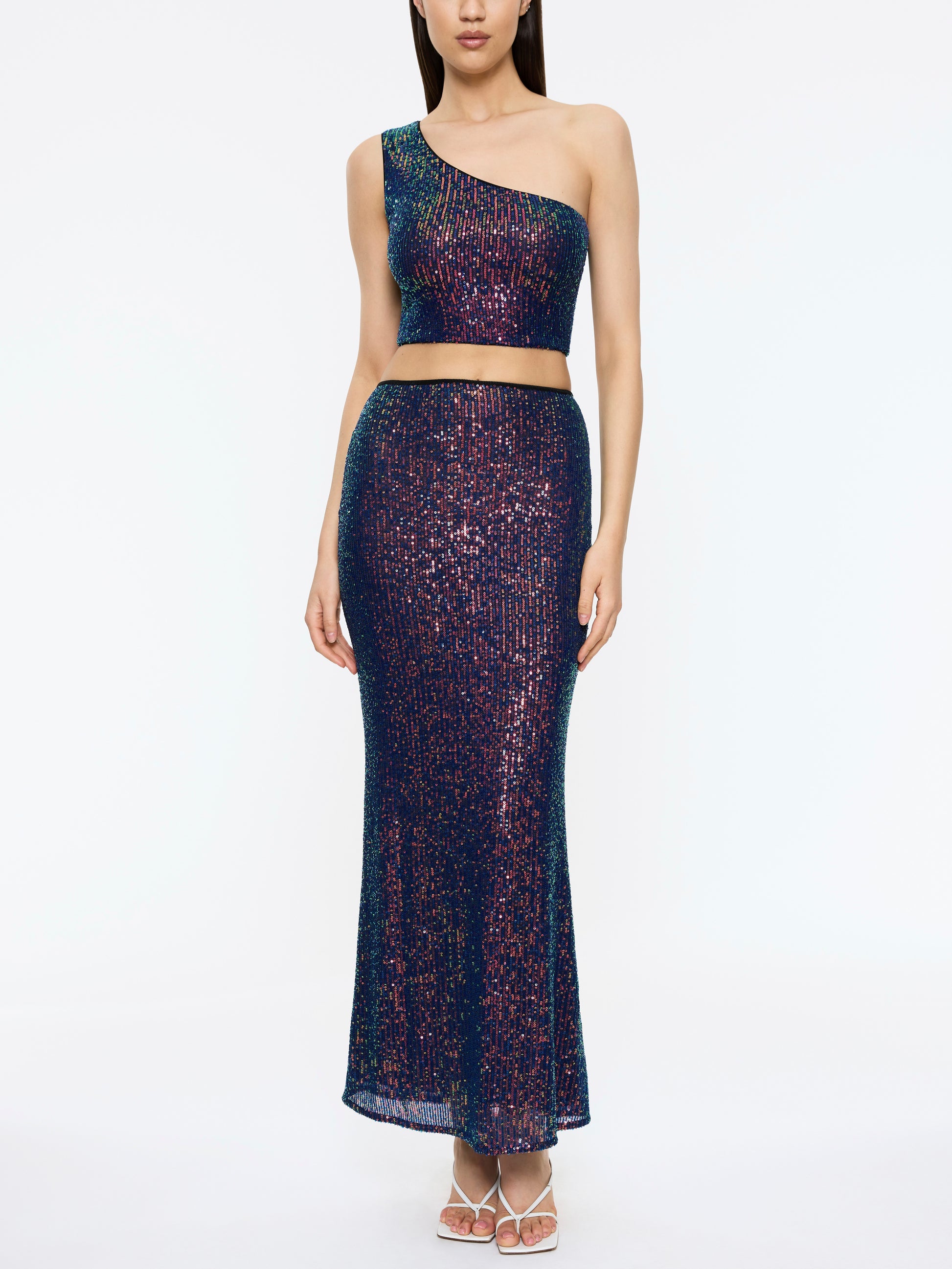 Like moonlight on water, the Éclat Sirène Two Piece shimmers with every movement. Cut from midnight blue sequins, this set pairs an asymmetric one-shoulder crop top with a sleek ankle-grazing skirt for a sculpted, modern silhouette. Bold yet refined, it’s designed to command attention: sensual, effortless, and unforgettable. Perfect for after-dark occasions when only sequins will do.