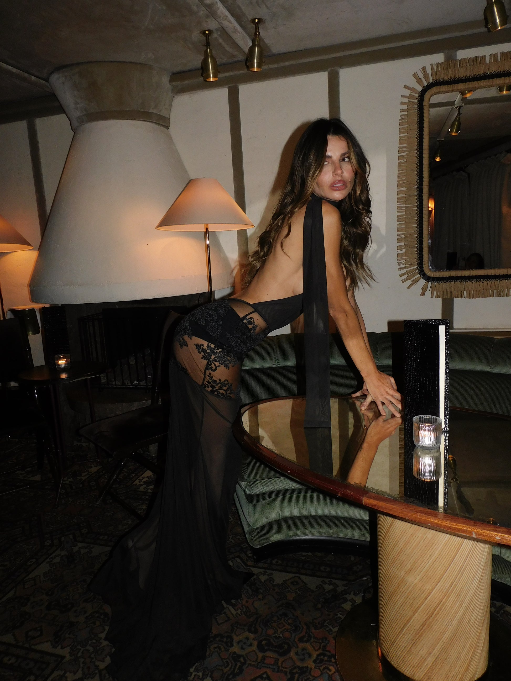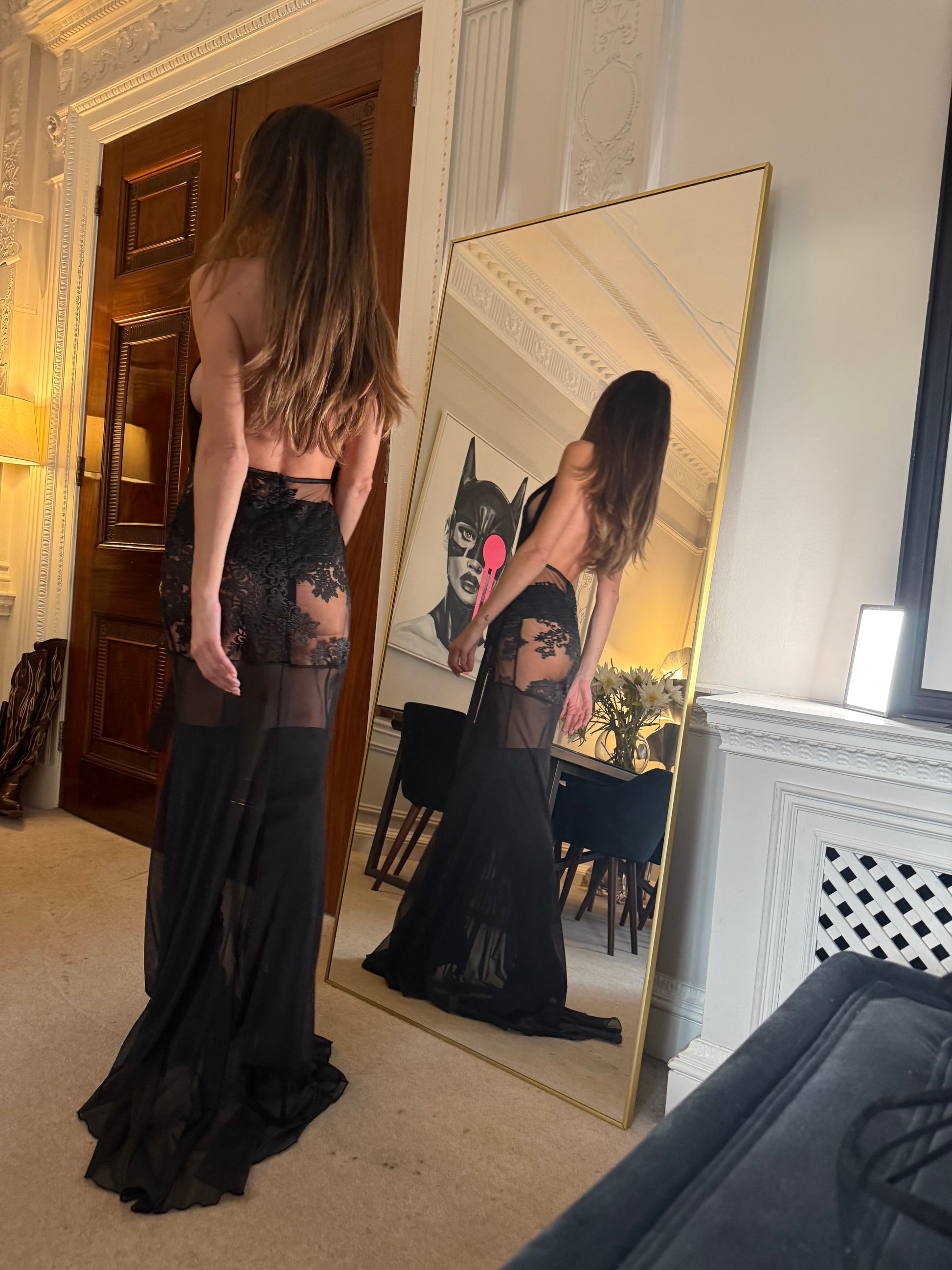 Cut from delicate French lace and sheer mesh, Eternal Midnight is the embodiment of effortless seduction. Its plunging neckline and see-through silhouette reveal just enough to captivate, while the fluid skirt moves with you, from London soirées to barefoot dancing under Ibiza’s stars.
