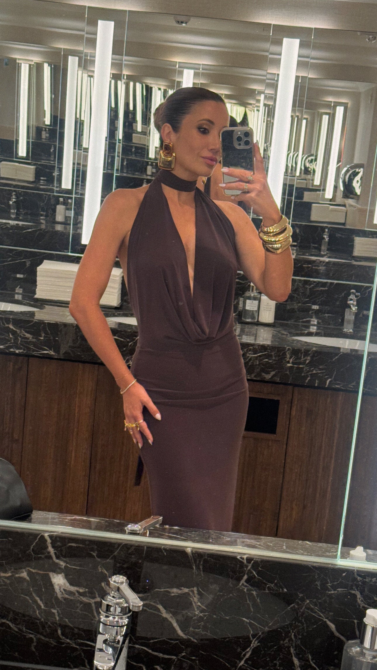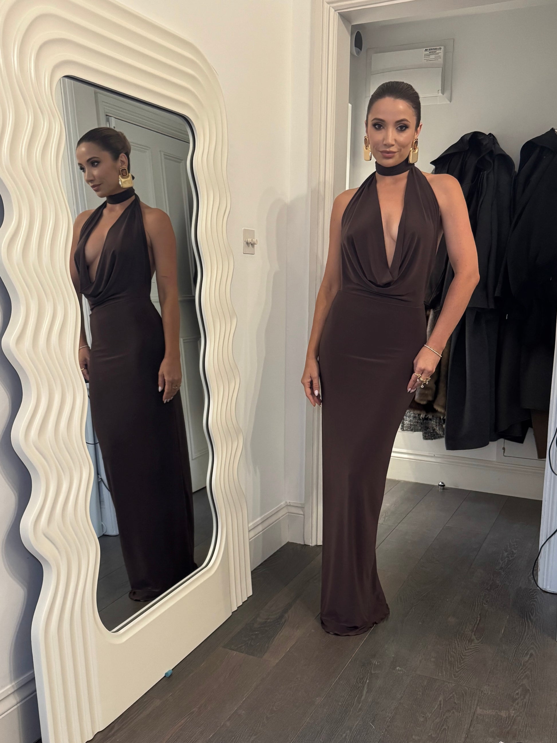 A statement in sensual draping. Cut from our premium double-stretch jersey, the Frisson Maxi skims the body while holding you in, contouring every curve with ease. A fluid, floor-length silhouette is defined by its low, cowl-draped neckline, adjustable to reveal as much or as little as you desire. A scarf-style neck tie completes the look, wrapping elegantly or seductively depending on your mood. Rendered in rich brown chocolate, this season’s most coveted shade, it moves with the body like liquid. A true Aloma staple: sophisticated, effortless, and undeniably head-turning.