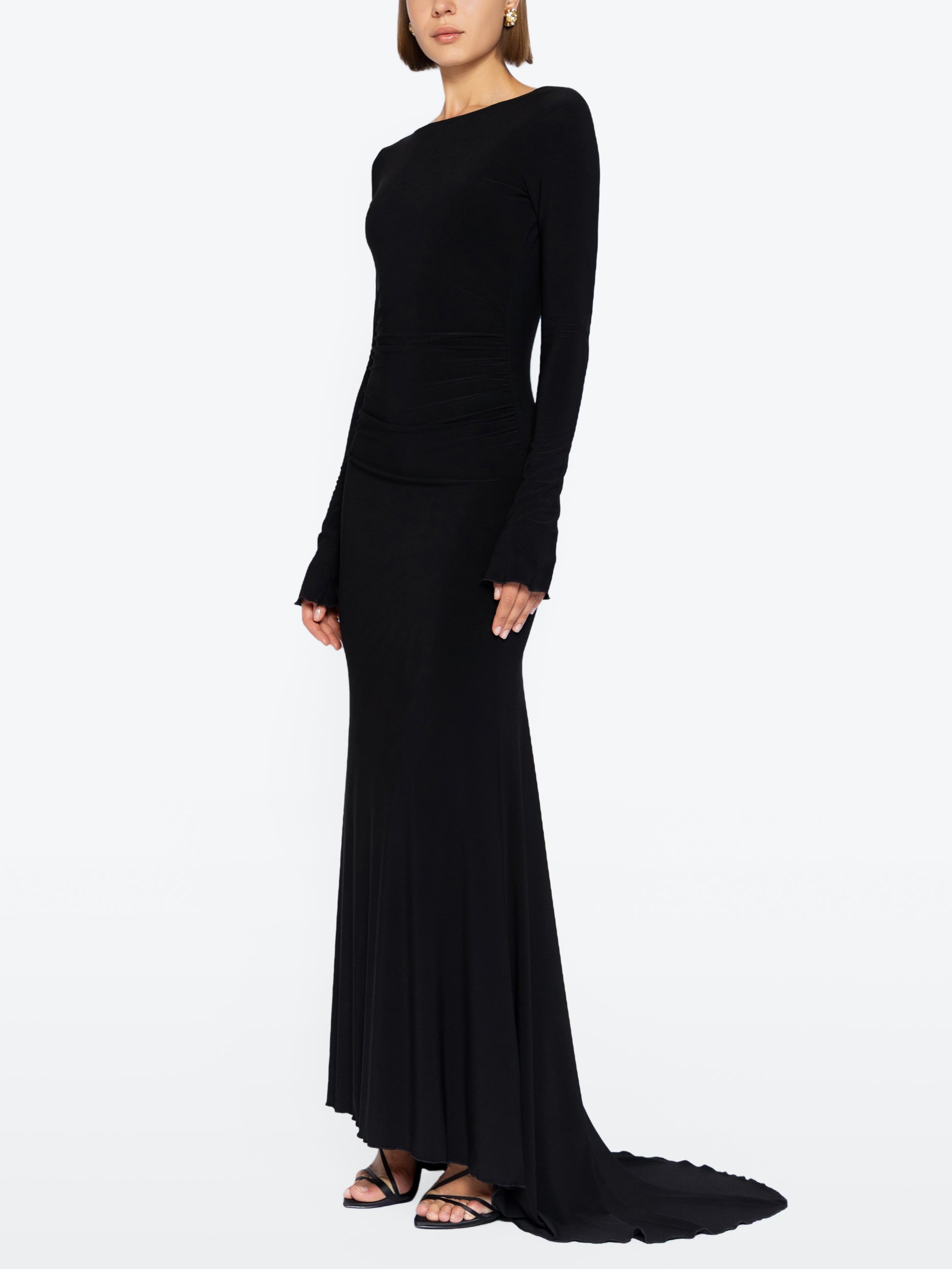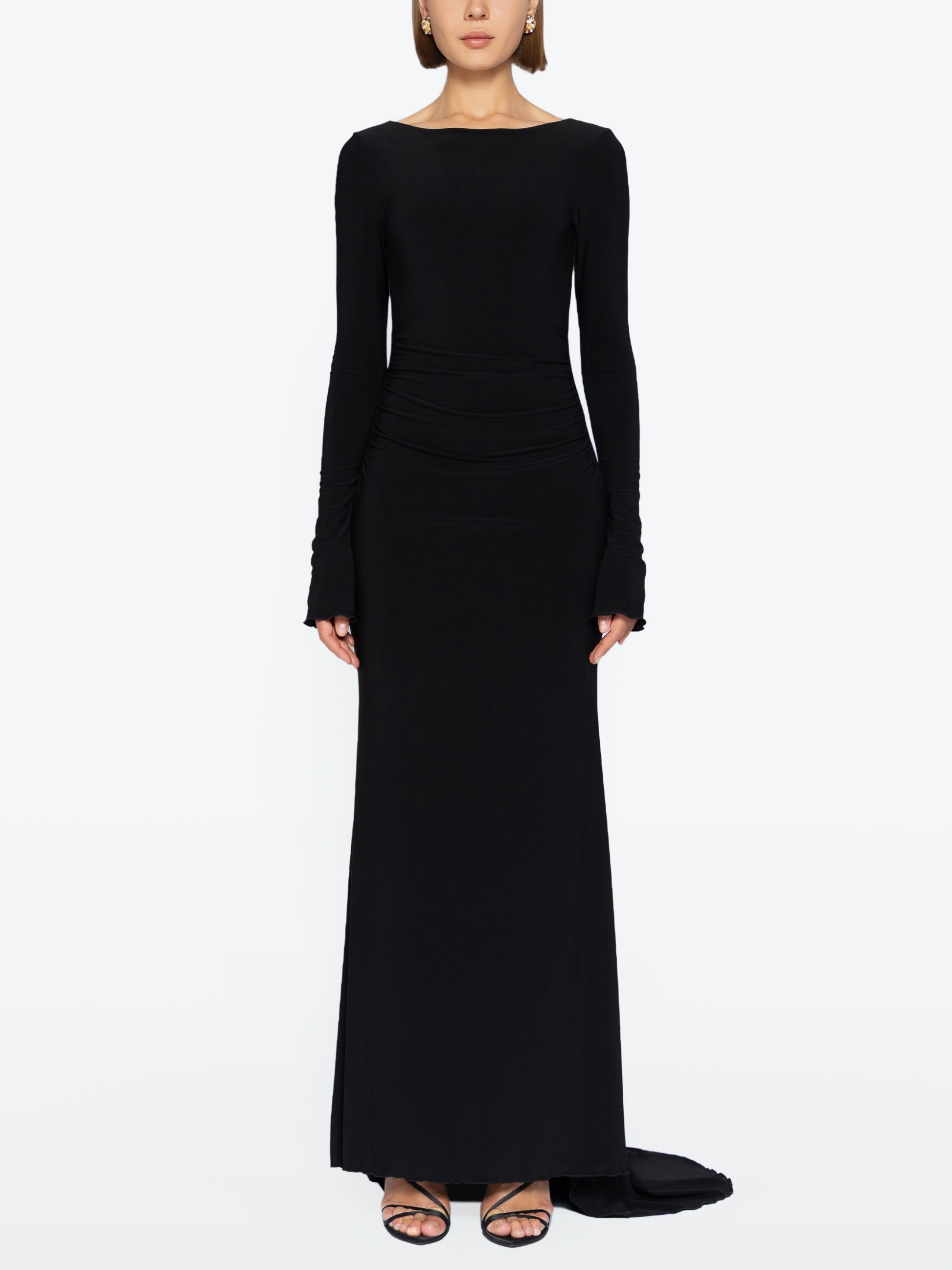 An evolution of an icon. The Lueur Gown in black jersey transforms Aloma’s signature silhouette into a statement of pure drama. Cut with long sleeves and a fluid, body-skimming fit, it falls into a sweeping trail that commands attention with every step. The low back reveals just enough, balancing allure with elegance. Sleek, sculpting, and unapologetically refined - this is Lueur reimagined for the grandest entrances.