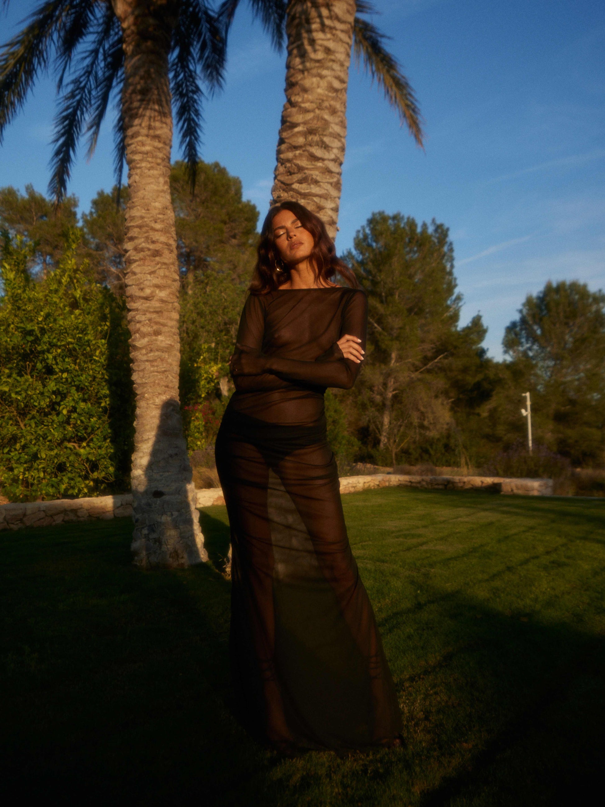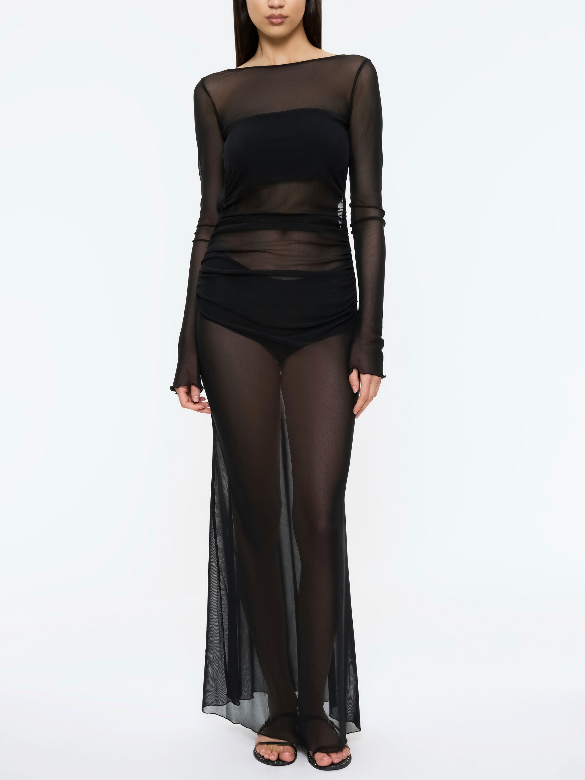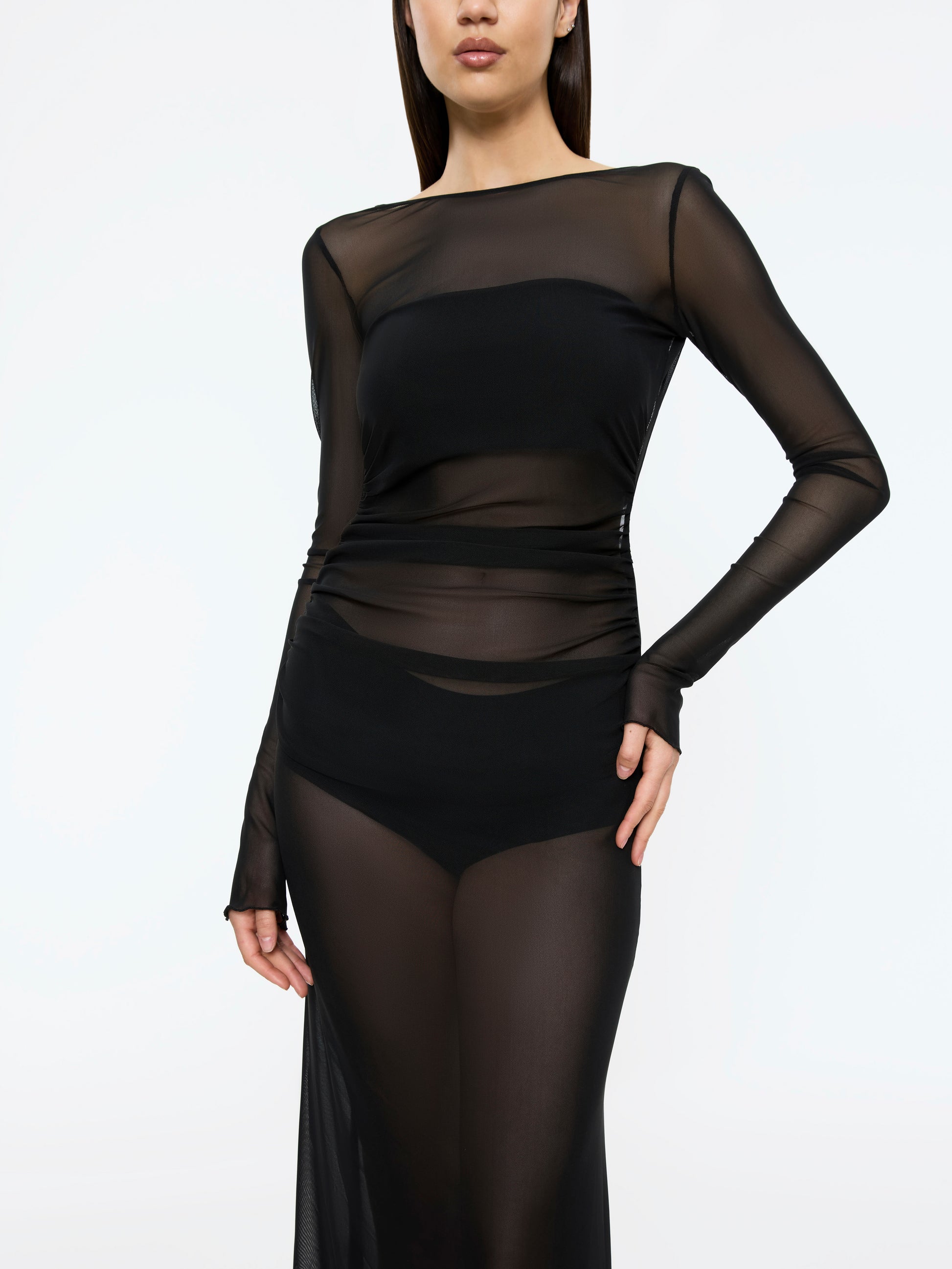 An icon of Aloma. The Lueur Dress in black mesh is sheer seduction, cut from weightless stretch mesh, it clings to the body with liquid precision, while the open back defines its sensual edge. Long sleeves balance its dramatic low back, while the body-skimming silhouette sculpts the frame and leaves skin just visible beneath. Unlined and unapologetically sheer, it’s a statement of confidence. LUEUR is the piece you’ll return to season after season.