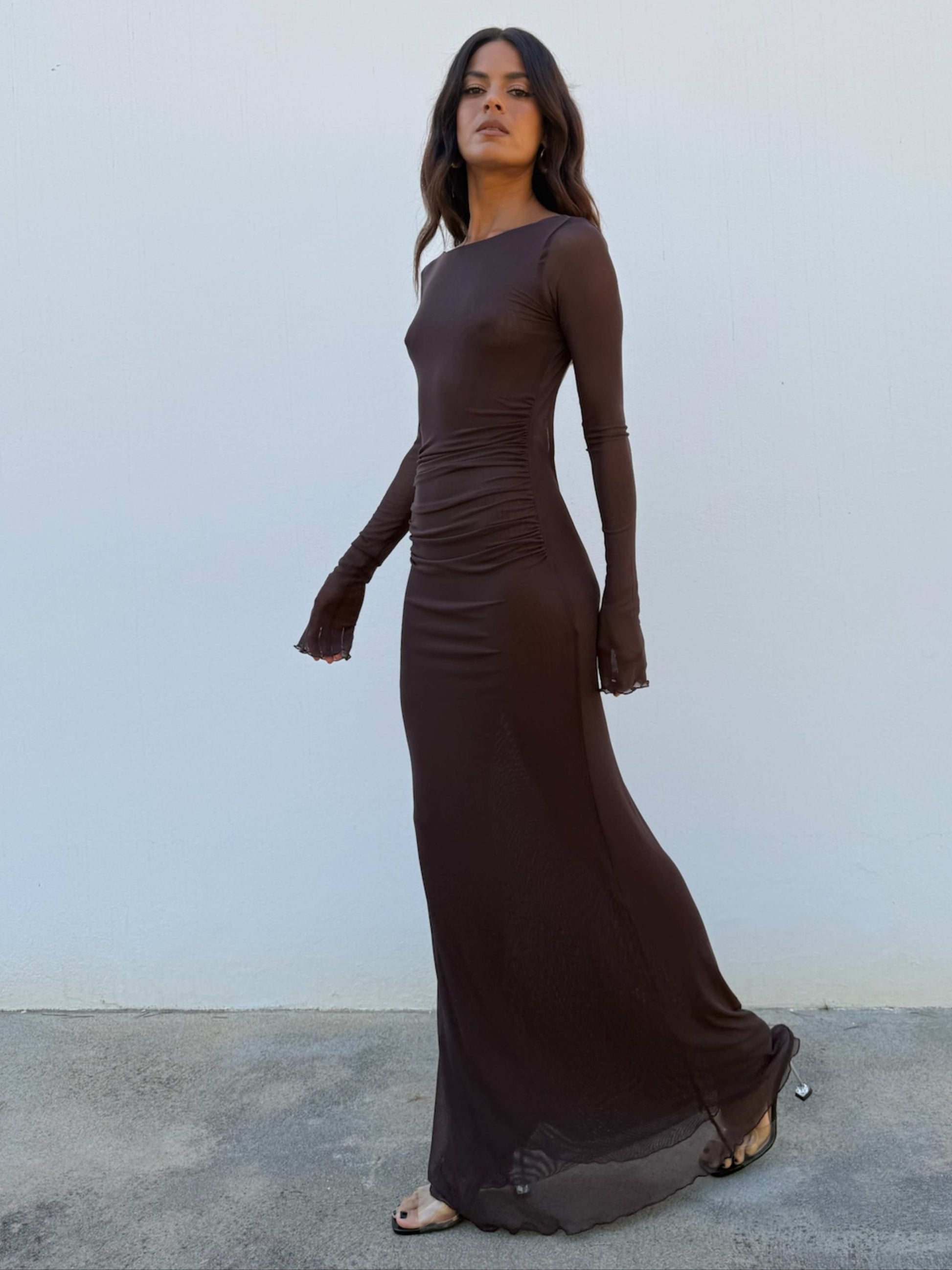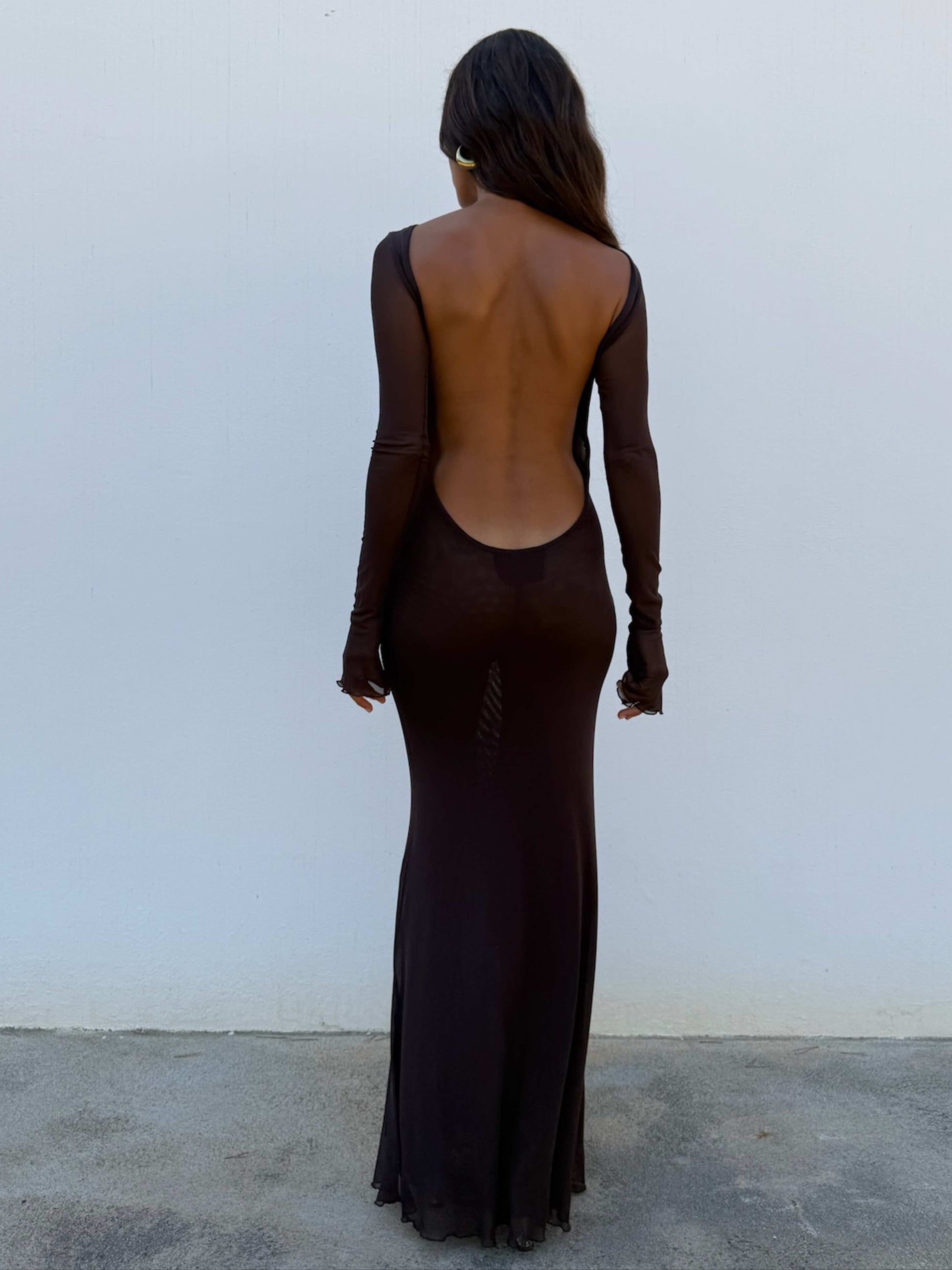 The Aloma signature, reimagined in earthy brown. The Lueur Maxi in mesh balances sleek minimalism with sheer seduction. Cut from semi-sheer stretch mesh, it skims the body with liquid ease, revealing just enough while leaving the rest to the imagination. Long sleeves temper the bold open back, creating a silhouette that is daring, elegant, and unapologetically modern.
