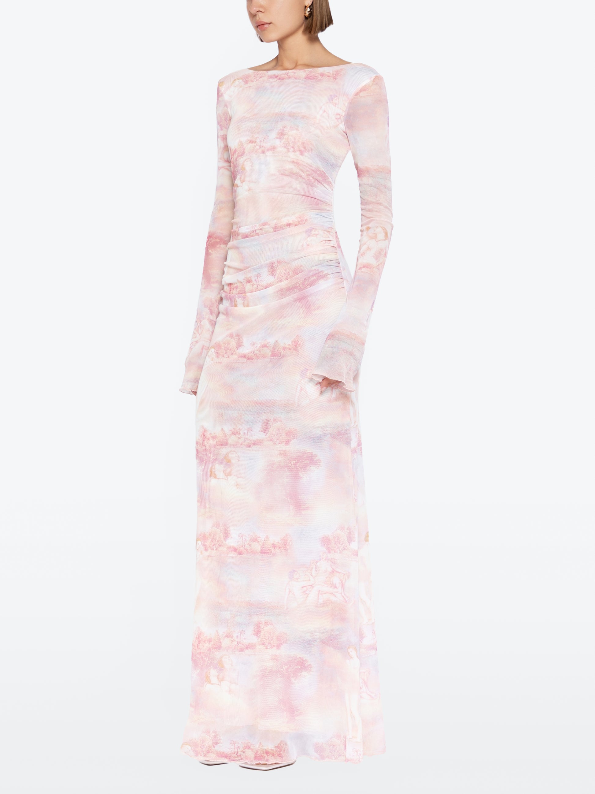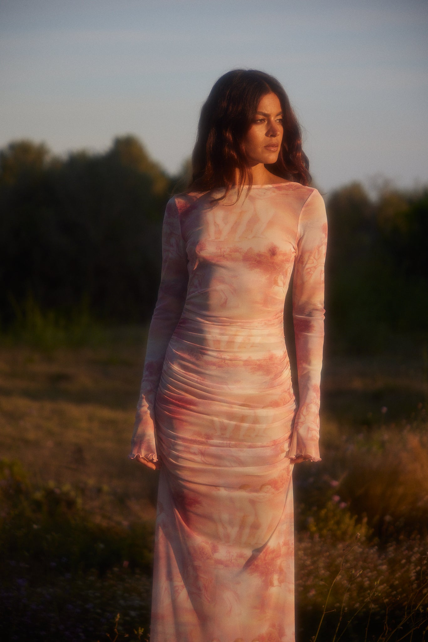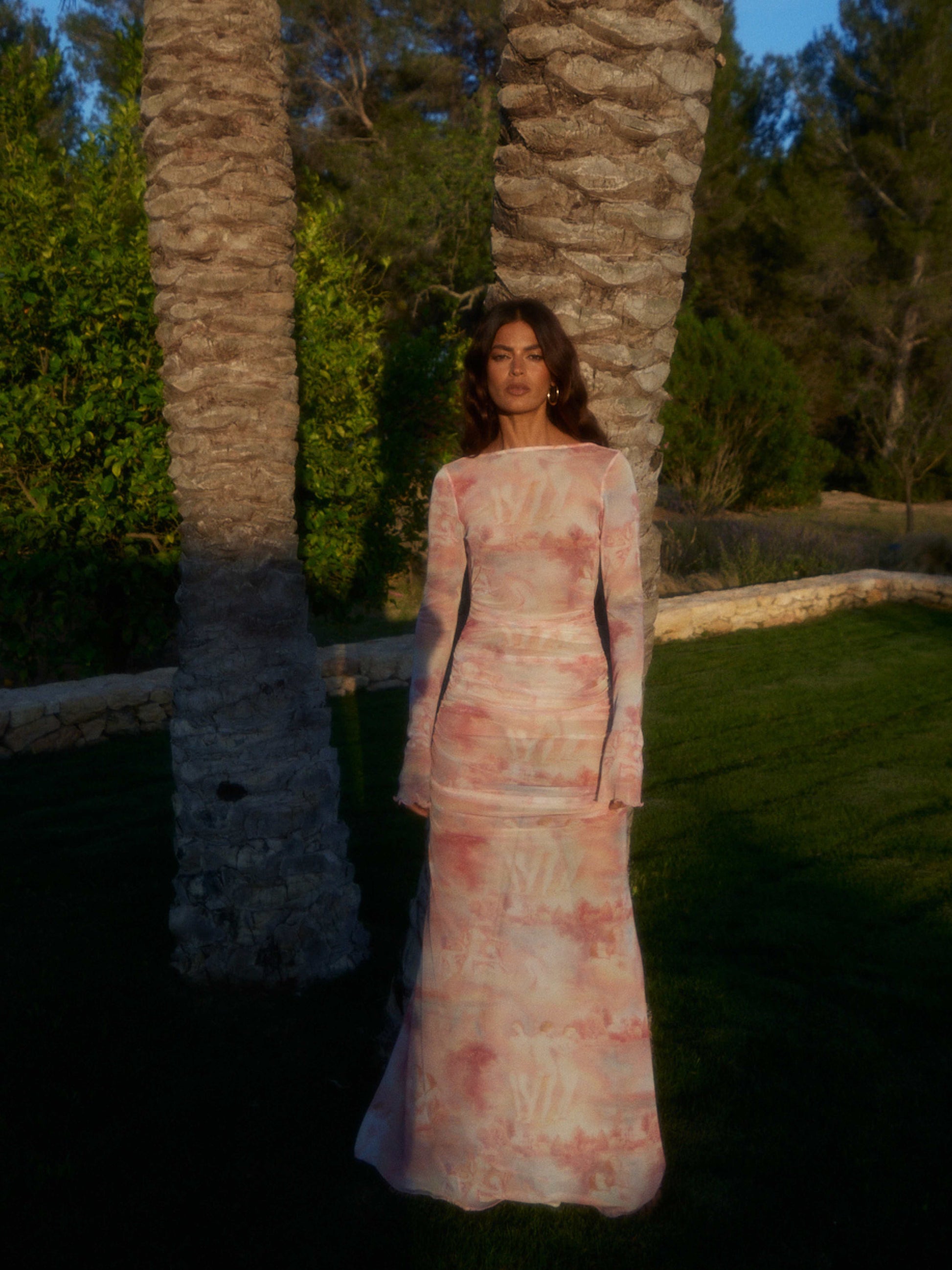 An icon of Aloma. The Lueur Dress in pink print mesh is sheer seduction, cut from weightless stretch mesh, it clings to the body with liquid precision, while the open back defines its sensual edge. Long sleeves balance its dramatic low back, while the body-skimming silhouette sculpts the frame. Lueur is the piece you’ll return to season after season.
