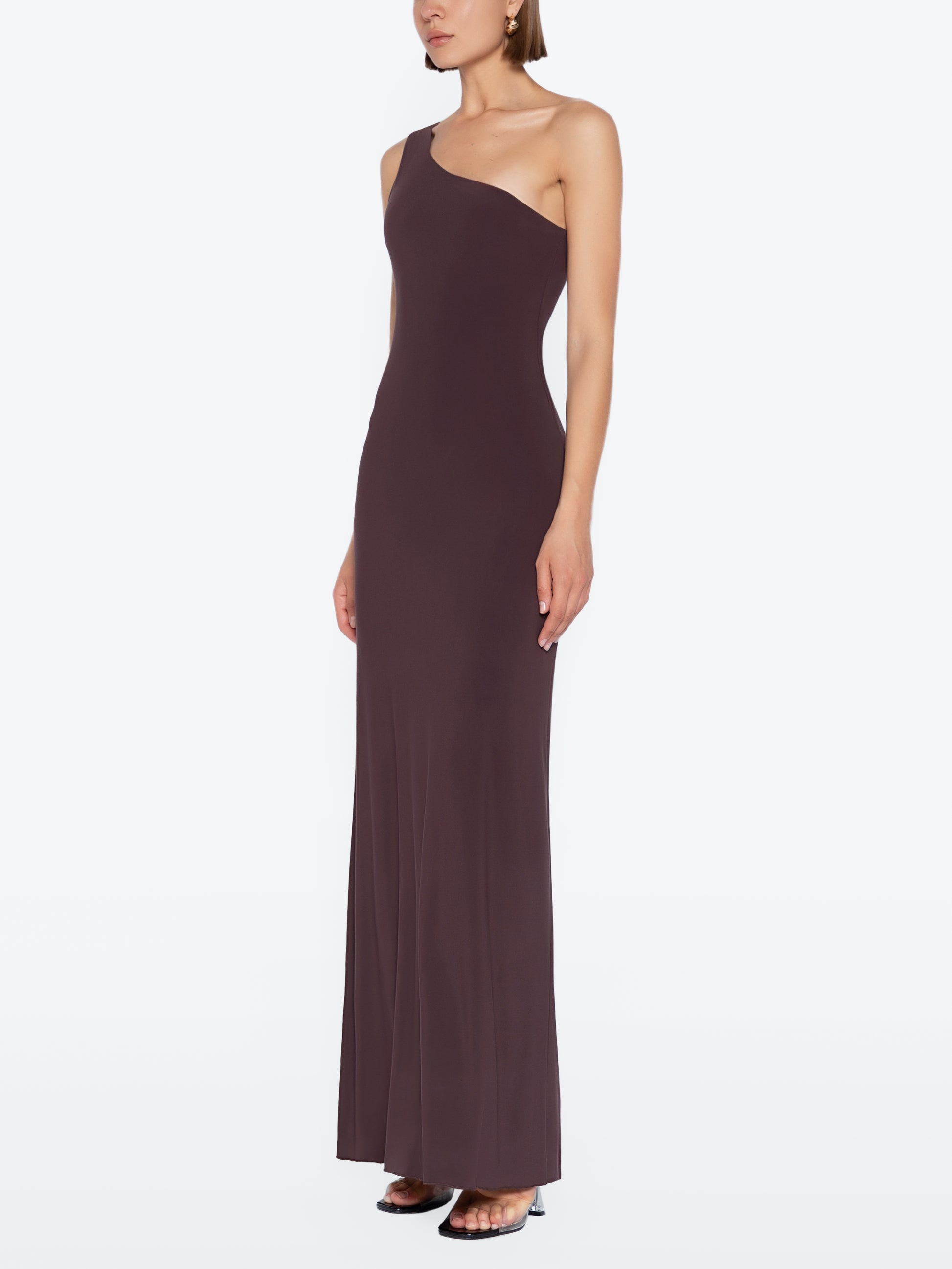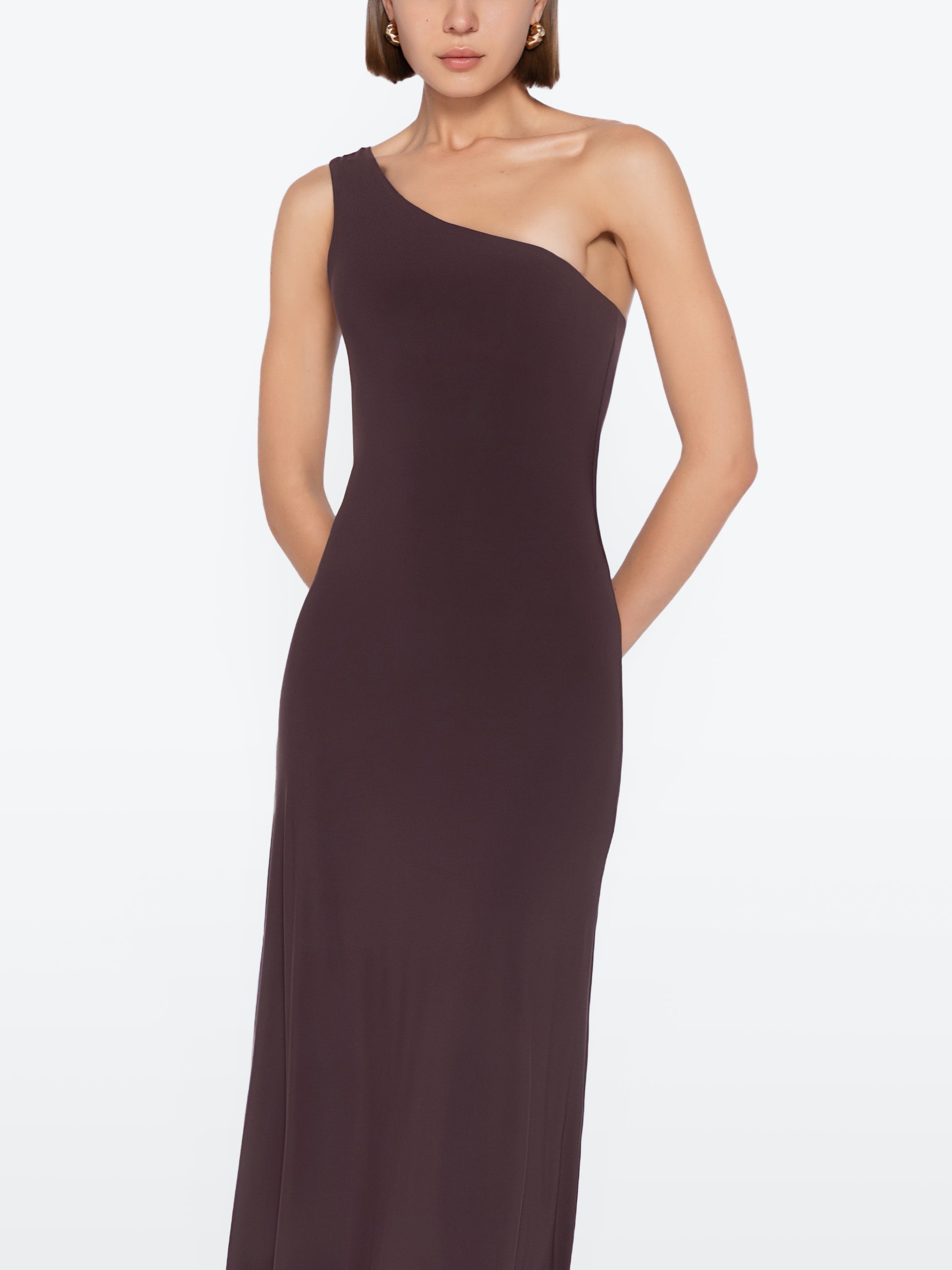 Cut on the one-shoulder in our signature stretch jersey, it sculpts the body with fluid precision and falls to a floor-grazing hem for effortless drama. The earthy brown shade adds depth and sophistication, making it as versatile as it is striking - perfect for intimate dinners, after-dark elegance, or destination evenings.