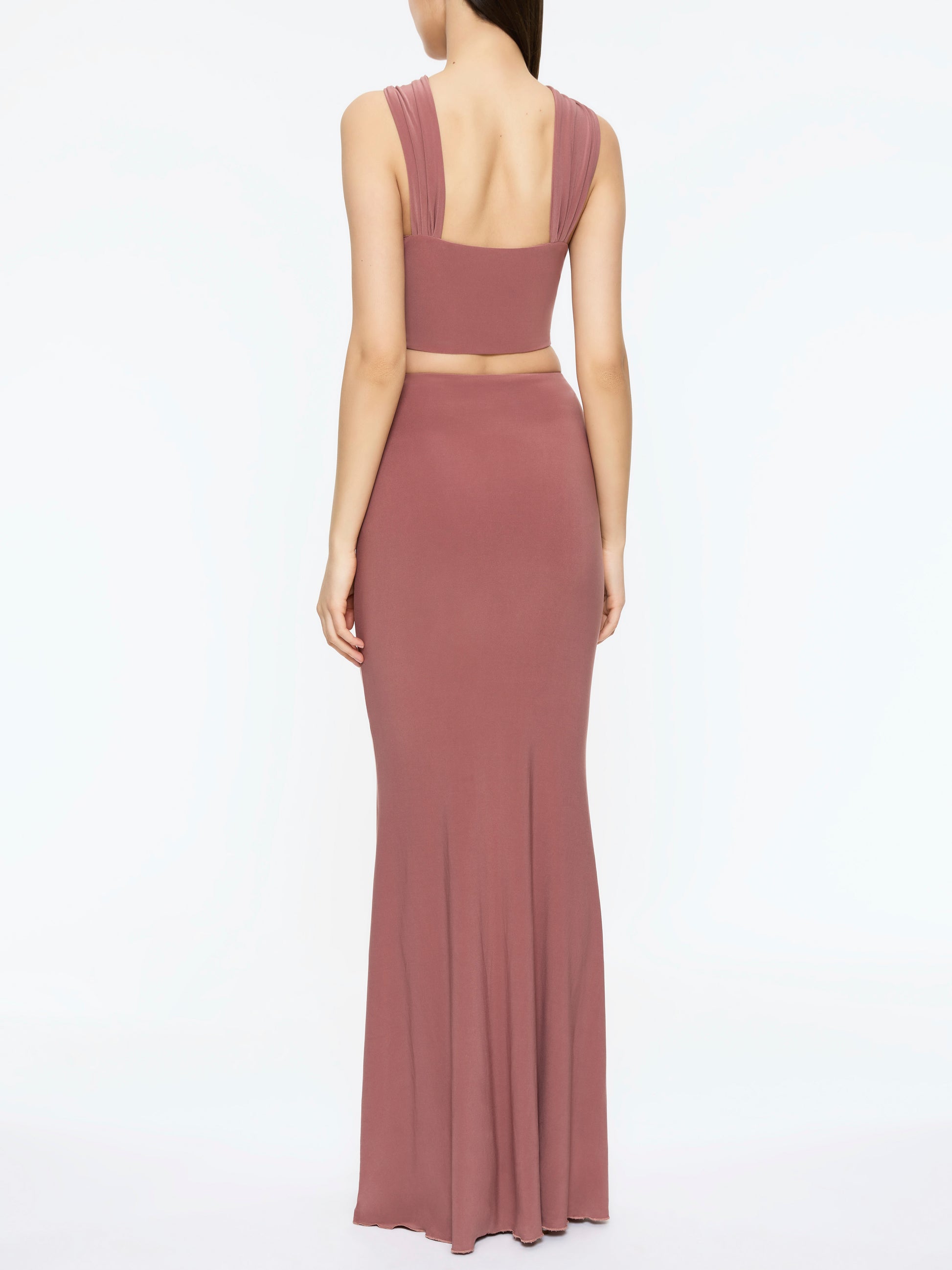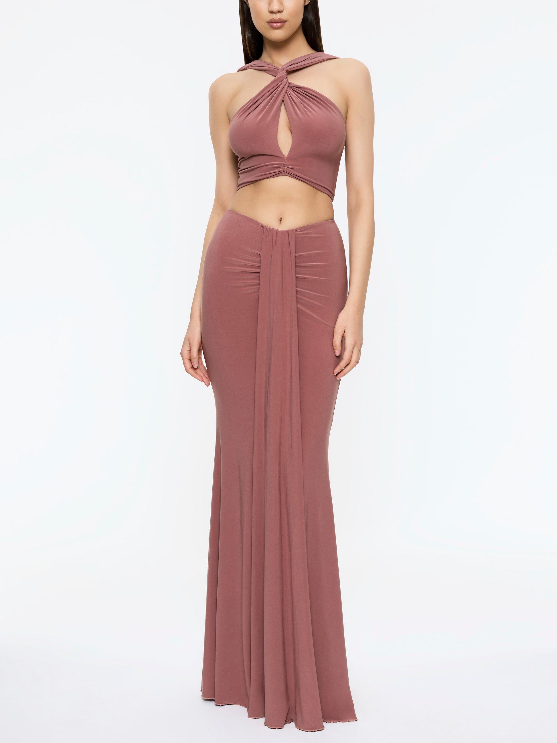 A modern ode to Grecian ease. The Tentation Two Piece pairs a sculpted off-shoulder, ruched crop top with a flowing maxi skirt in fluid jersey. Designed in chestnut, this set moves effortlessly with you — sensual, flattering, and unforgettable. Worn together, it creates a seamless silhouette; styled separately, it becomes two versatile staples you’ll wear again and again.